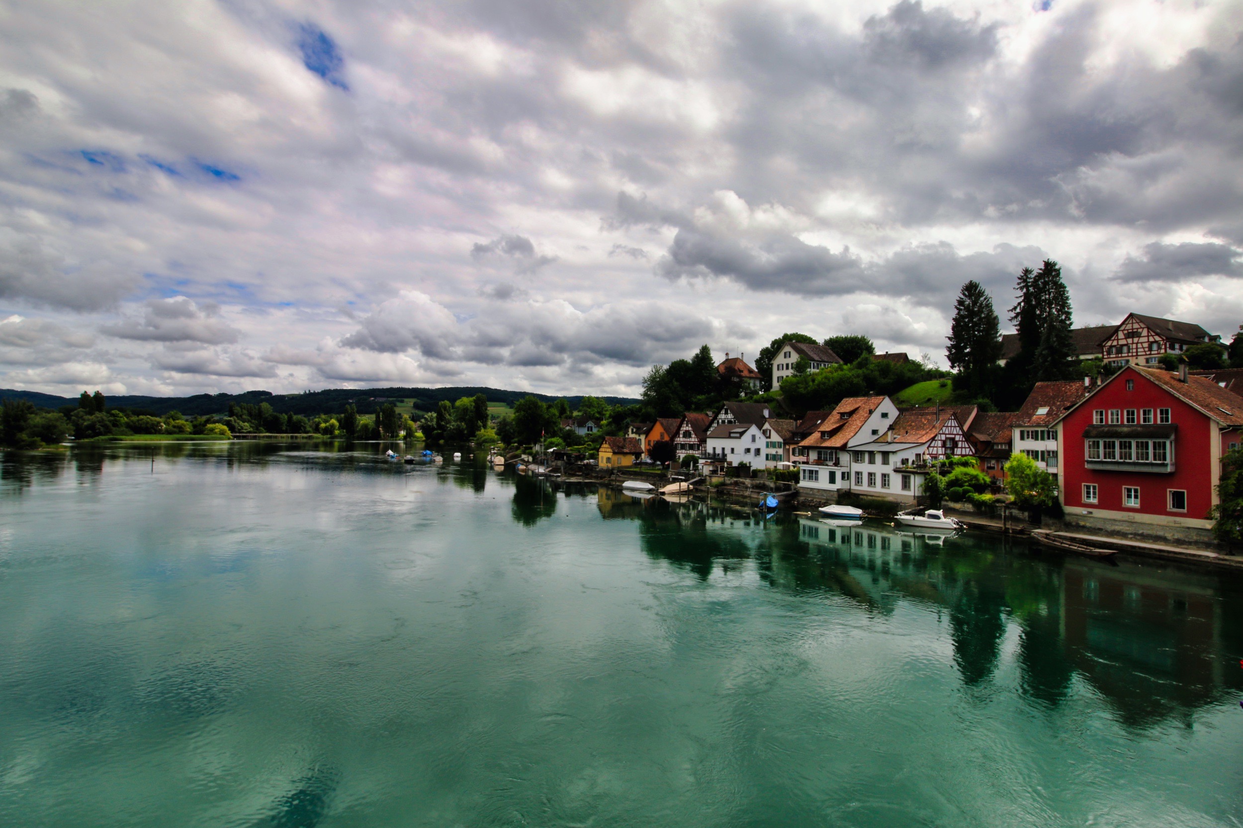 עיירה ציורית על גדת נהר משתקפת במים תחת שמיים מעוננים | Picturesque Town on a Riverbank Reflected in the Water under Cloudy Skies
