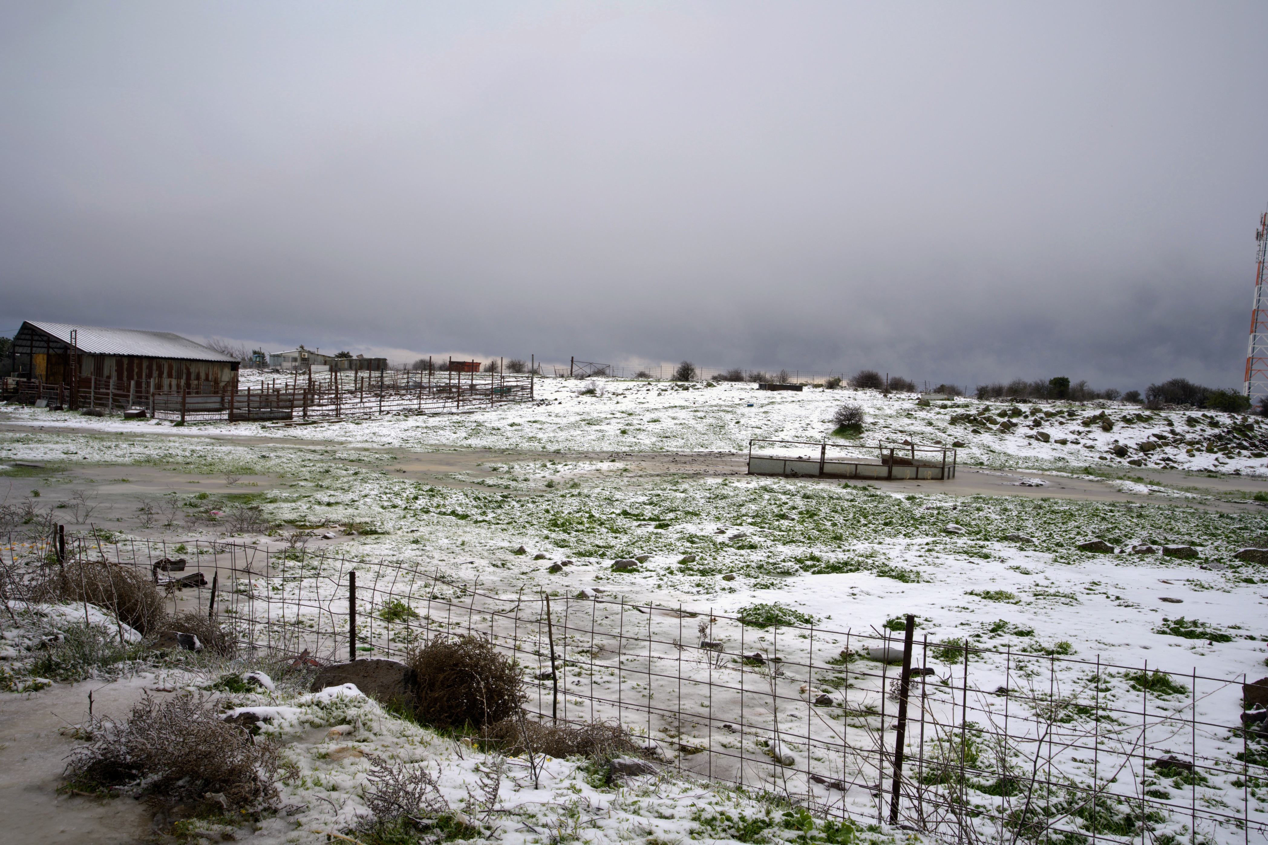 נוף חורפי מושלג של חווה חקלאית תחת שמיים קודרים ומעוננים | Snowy Winter Landscape of an Agricultural Farm under Gloomy and Cloudy Skies