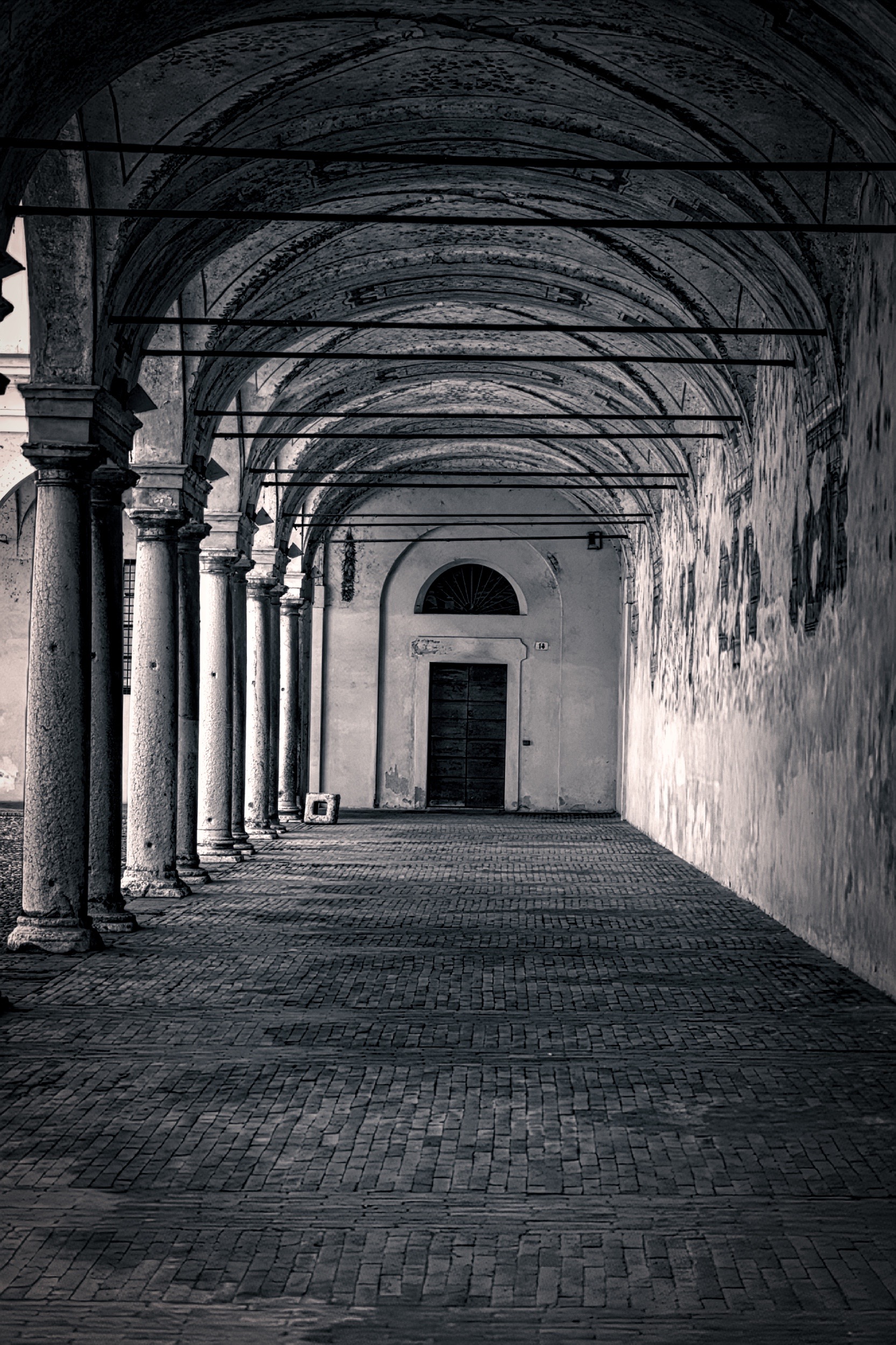 מבט עומק לאורך מעבר עמודים (ארקדה) עתיק ומרוצף עם קשתות ודלת